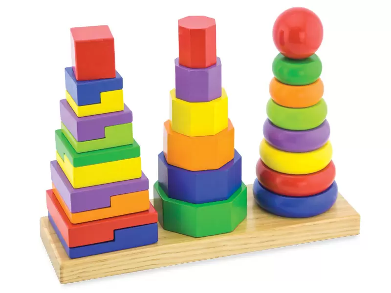 3 bokštai – tai medinė piramidė, sudaryta iš pagrindo su kaiščiais bei įvairiaspalvių kaladėlių skirtingų formų ir dydžių. Vaiko užduotis – sudėti bokštą pagal paveikslėliu pateiktą instrukciją, taip lavinant stebėjimo įgūdžius ir loginį mąstymą.
