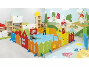 Apsauginė tvorelė su varteliais ir įvairiomis dekoratyvinėmis plokštėmis (įskaitant labirintą, manipuliacinę sienelę, saugius akrilinius veidrodžius ir besisukantį ratą). Plokštės sujungiamos įspaudžiamais jungtukais. Plokštės ir jungtukai pagaminti iš MDF. 16 dalių, kiekvienos aukštis 60–80 cm, plotis 80 cm.