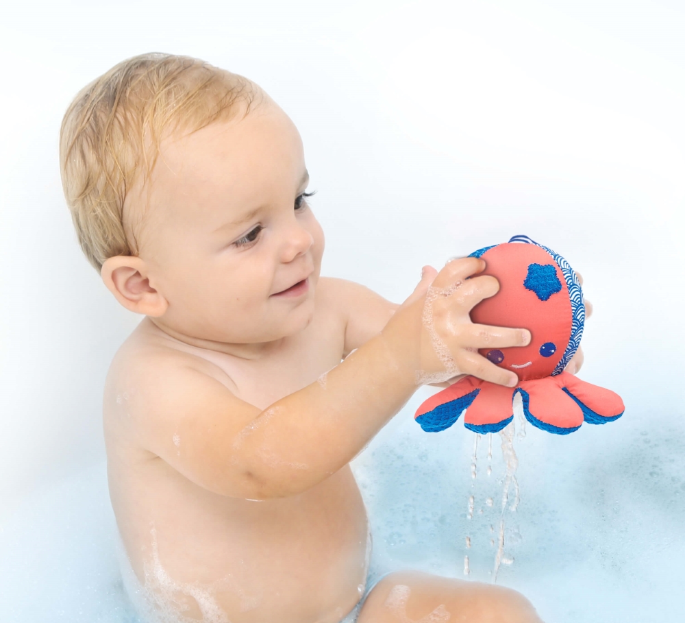 Mėgaukitės švaros džiaugsmu su kempinėle aštuonkoju! Šis vonios žaislas sudomins mažylius savo tekstūromis ir padės pratintis prie savarankiško prausimosi.
