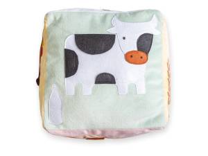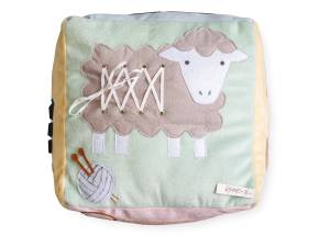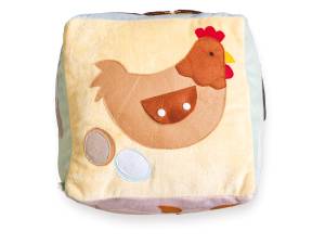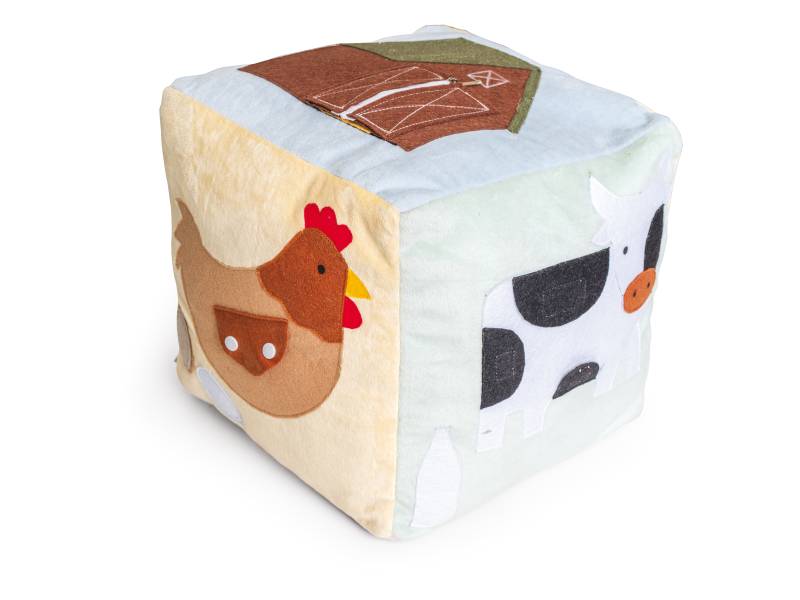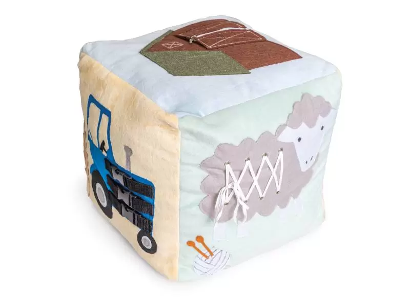 Didelė minkšta edukacinė manipuliacinė kaladėlė skirta vaikų pažinimui ir sensorinių įgūdžių lavinimui. Kiekvienoje pusėje yra pora elementų: gyvūnas, žemės ūkio mašina arba pastatas su jam priskirtu atributu (pvz., avis – vilna, karvė – pienas, višta – kiaušiniai, traktorius – grūdų varpa, paršelis – mėsa, tvartas – šiaudai).
