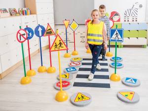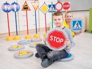 Putplasčio diskų su kelio ženklų simboliais rinkinį sudaro 10 sėdimų diskų, puikiai tinkančių žaidimams ir mokymuisi. Diskai pagaminti iš PVC audinio be ftalatų, atsparaus trinčiai, todėl yra ilgaamžiai ir lengvai prižiūrimi. Skaitmeniniai atspaudai suteikia diskams patrauklią išvaizdą ir padaro juos lengvai pastebimus vaikams.